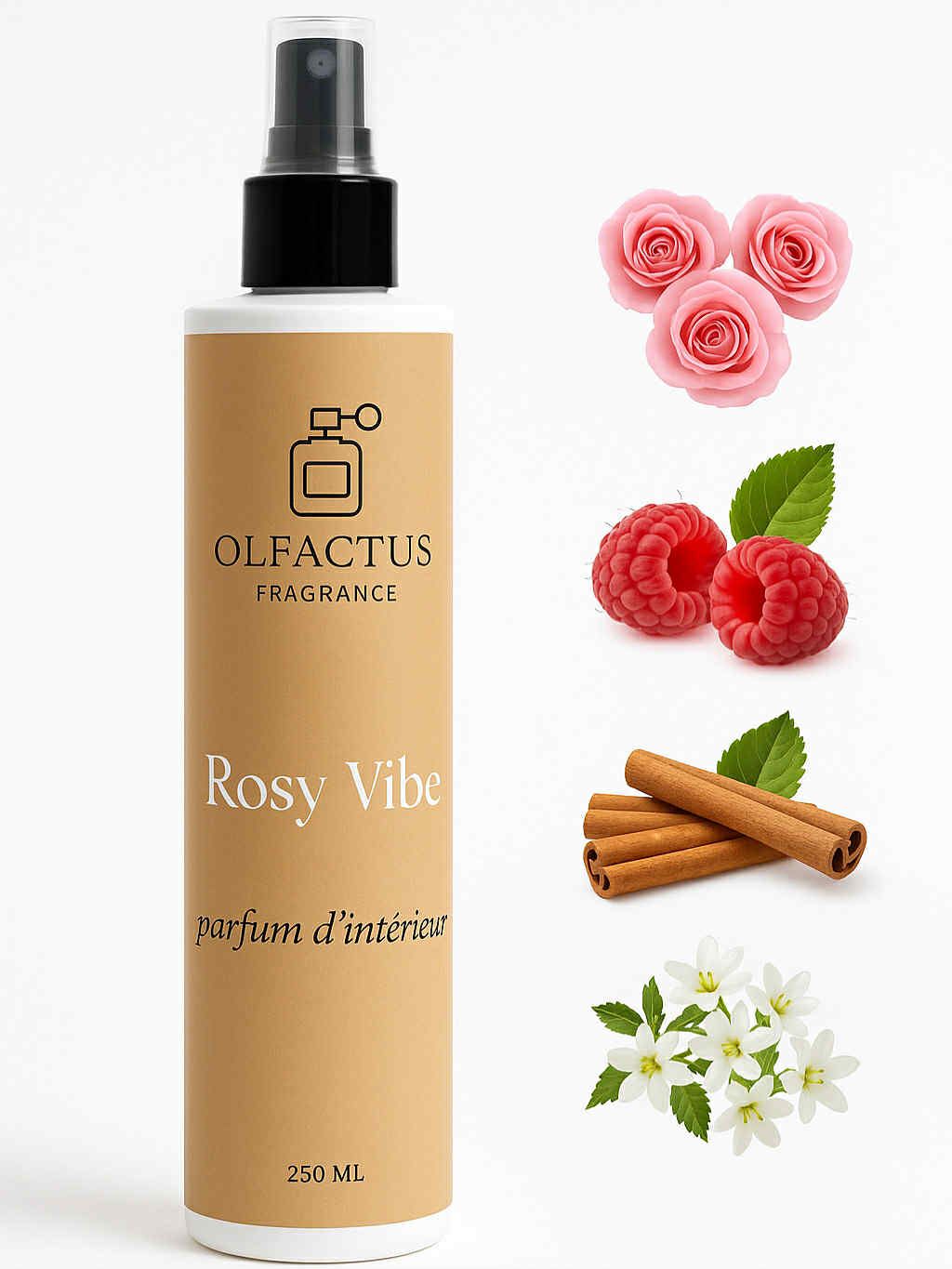 Rosy Vibe – Parfum d’intérieur Une brume raffinée qui enveloppe votre espace d’un souffle floral et chaleureux. Les pétales de rose s’unissent à la douceur fruitée de la framboise, relevées par une touche épicée de cannelle et la délicatesse du jasmin